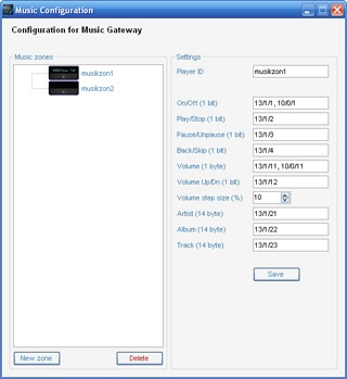 Med MusicGateway kan du styra dina ljudzoner (Squeezeboxar från Logitech) från KNX och samtidigt få tillbaka musikinformation (artist, album, låttitel) till KNX. Varje ljudzon kan styras individuellt med vanliga styrningar som på/av, play/stopp, nästa/föregående låt, volym upp/ner mm.